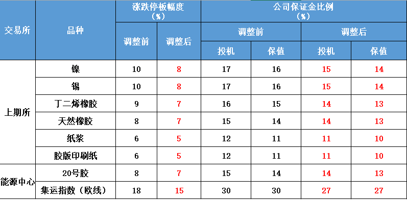 根据上能发〔2025〕39号、上期发〔2025〕287号、上期发〔2025〕288号通知,经公司研究决定自2025年10月14日(星期二)结算时起,对相关期货品种交易保证金比例和涨跌停板幅度进行调整,具体标准详见下表:
