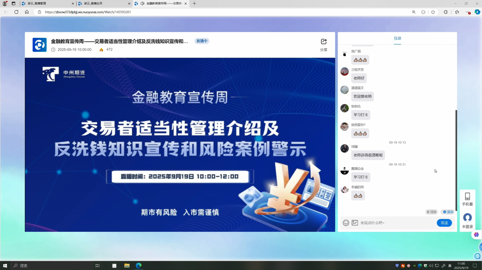 2025年9月19日,在郑州商品交易所的大力支持下,中州期货举办了“金融教育宣传周--交易者适当性管理介绍及反洗钱知识宣传和风险案例警示”线上投教活动,活动邀请了中州期货客服中心开户与客服经理郭豌帆中州期货以及河南分公司市场开发经理周培元进行了专题讲解,吸引了众多交易者参加。